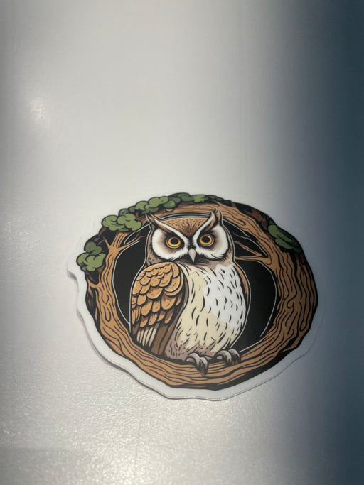 Add a touch of whimsy and elegance to any surface with our Horned Owl Sticker. Featuring a majestic owl with large, piercing eyes, sitting atop a t...