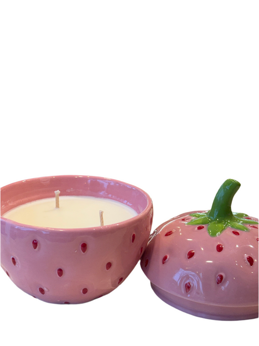 100% soy candle in a refillable ceramic strawberry jar. So cute and a great gift! And with all of our candles it is refillable.