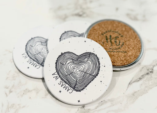 Our coasters are made of high quality ceramic and have a thin cork backing to protect your surfaces from scratches. Each coaster is 4” by 4” Handwa...