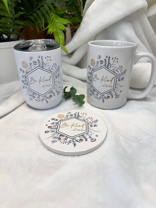 Express your attitude with this mug featuring the phrase "Be Kind... of Bitchy" in bold, black lettering, making it a perfect addition to your dail...
